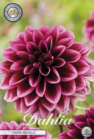 Davina Michelle är en dahlia som verkligen drar blickarna till sig. Blommans mitt är mycket mörk och ger ett djup som sedan mjuknar ut i lila toner mot kronbladens ytterkanter. Även undersidan av blomman och stjälkarna går i mörklila nyanser, vilket förstärker sortens dramatiska uttryck.