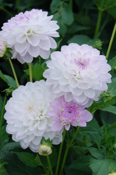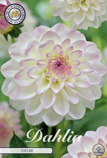 Eveline är en elegant bolldahlia med vita blommor som har ett diskret lila skimmer. Blommorna är cirka 10 cm stora och har en jämn, rund form som ger ett lugnt och stilrent uttryck i både rabatt och bukett.
