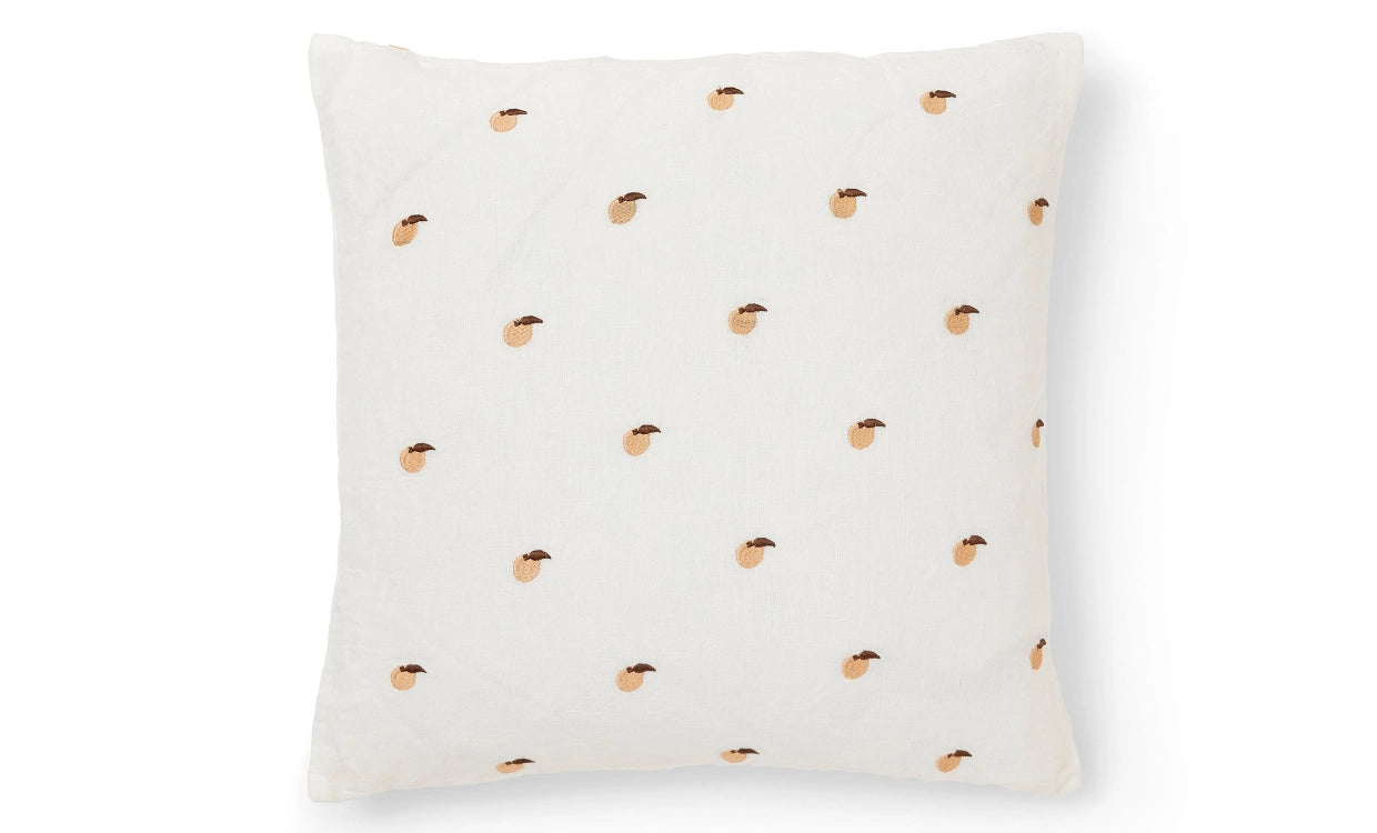 Kuddfodral med broderade persikor.