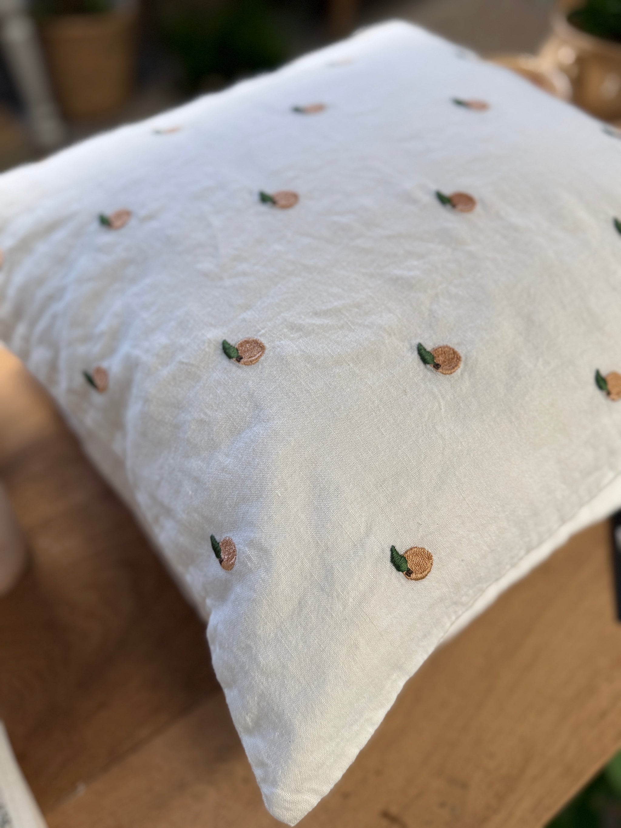 - Charmigt kuddfodral med små broderade persikor.