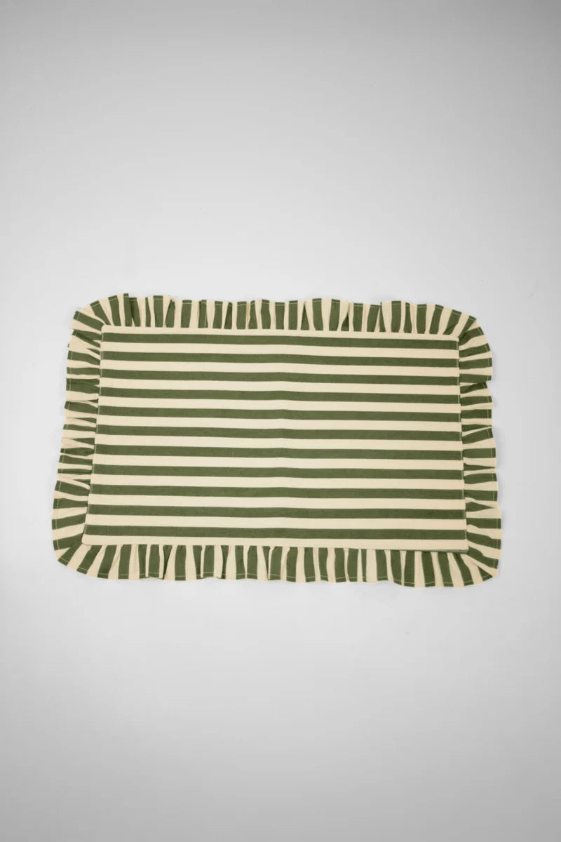 Randigt bordsunderlägg i grönt med dekorativ volangkant. En mix av romantik, cool elegans och ombonad känsla som lyfter varje dukning. Från Olsson och Jensen.