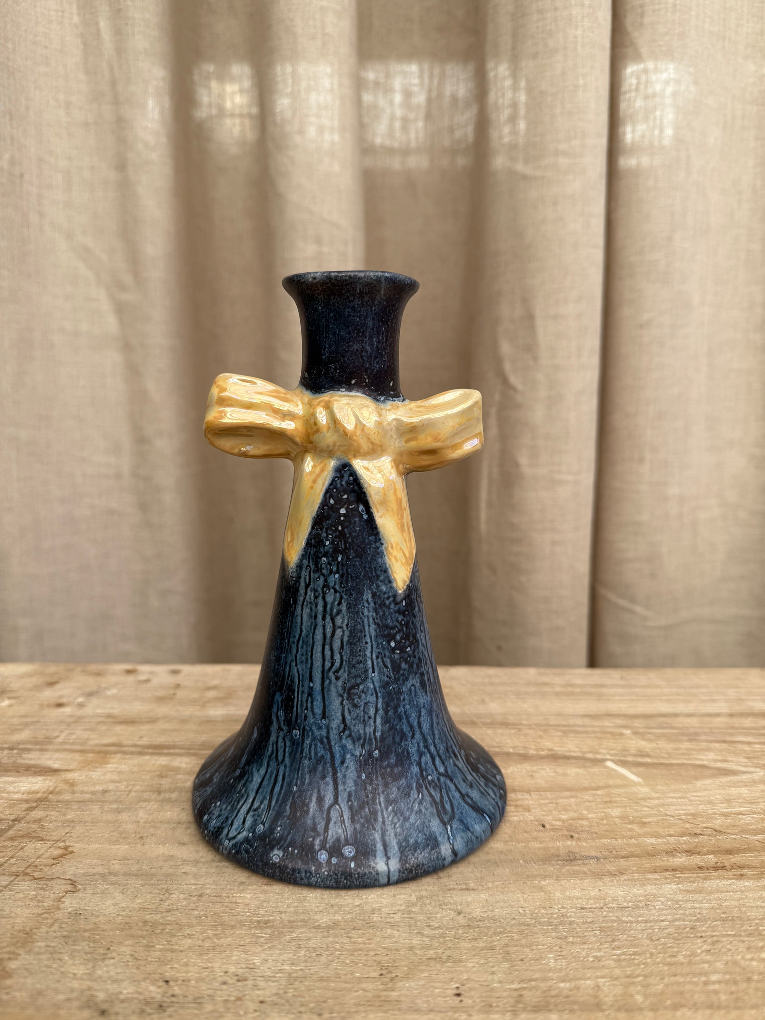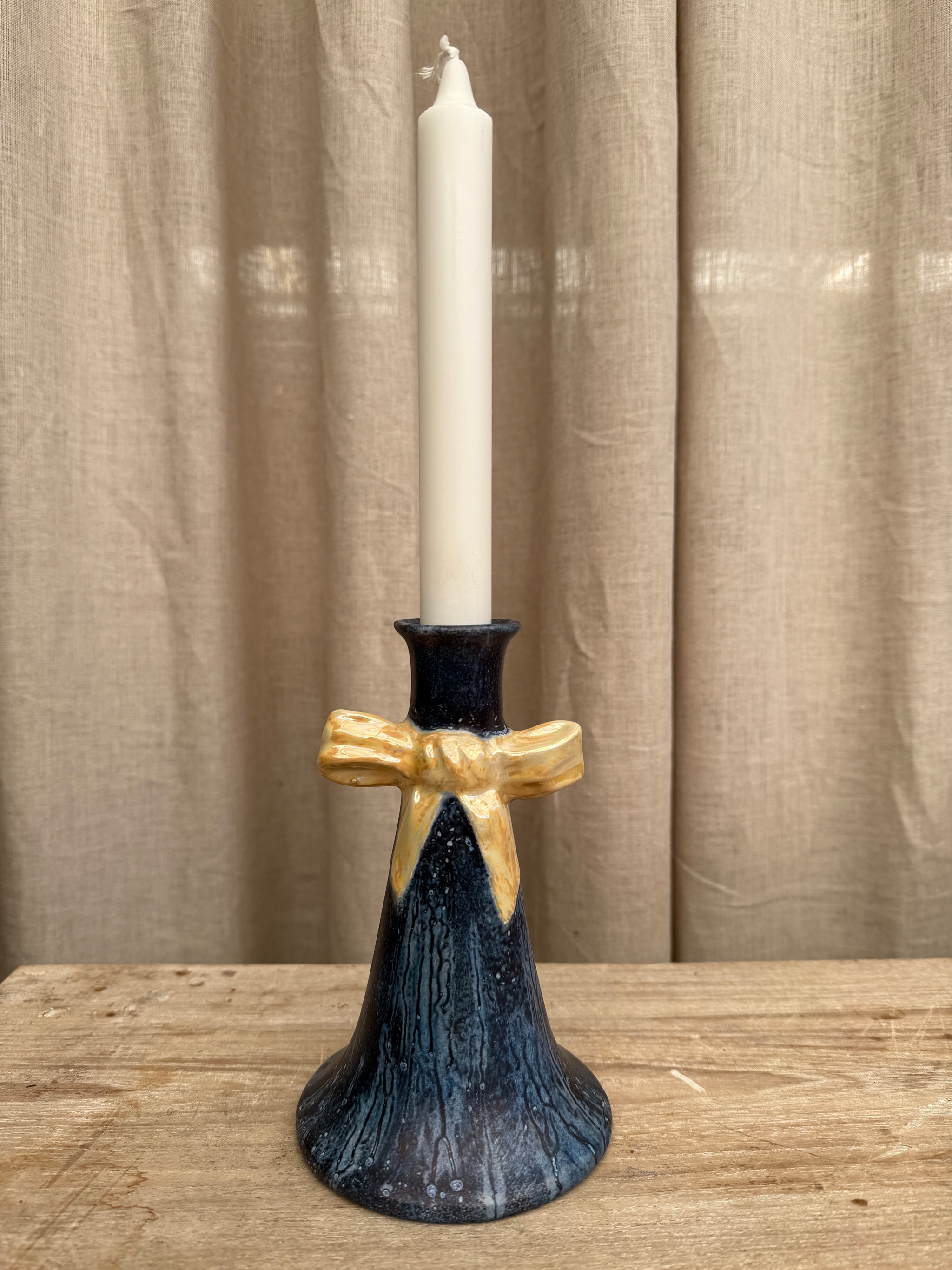 Fin blåmelerad ljusstake för kronljus. Guldig rosett.